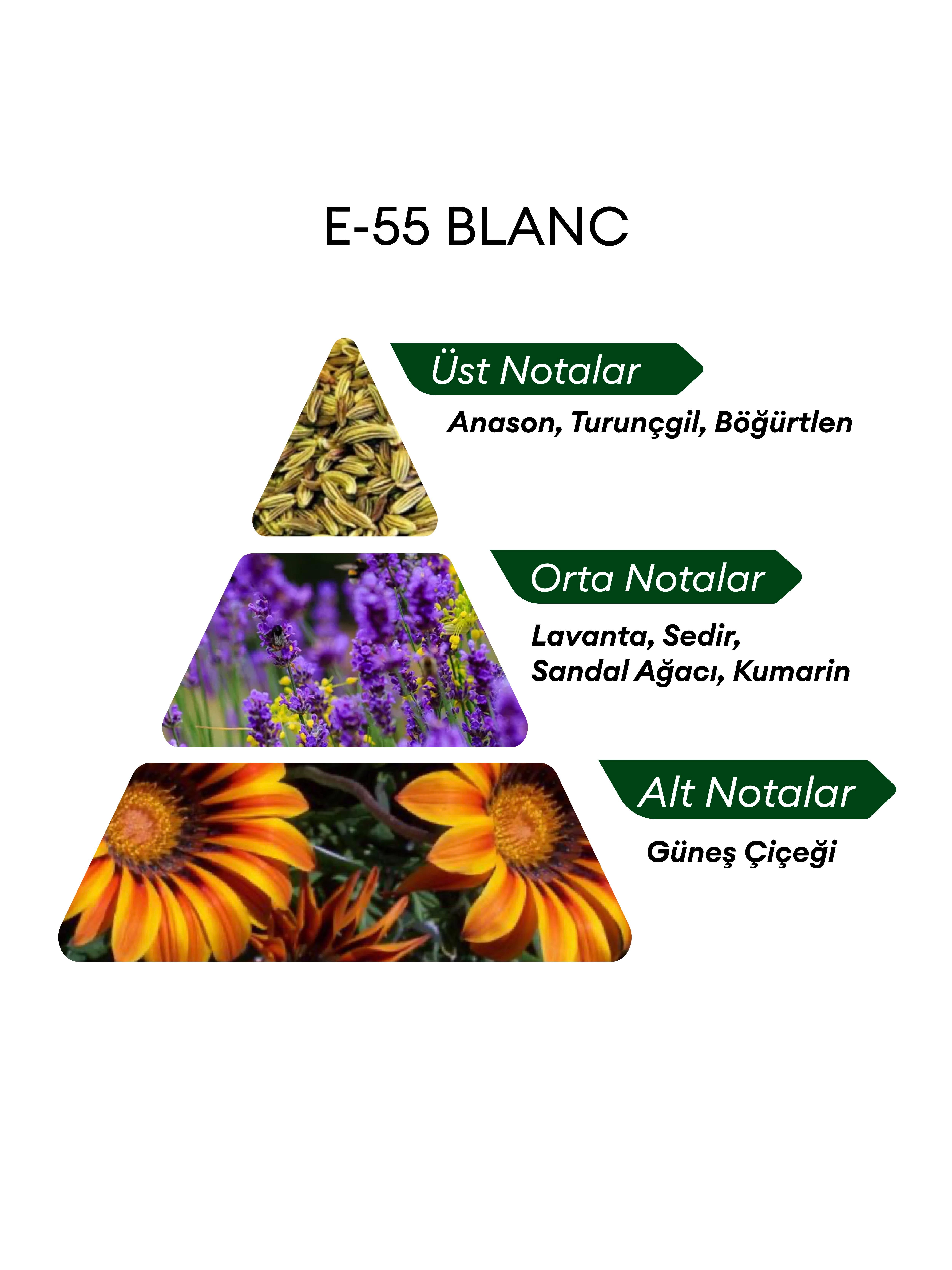BLANC E55, cesur, genç ve dinamik erkekler için özel olarak tasarlanmış enerjik ve etkileyici bir erkek parfümüdür. Parfüm, turunçgil ve anasonun taze ve canlı açılışıyla başlar; ardından lavanta, sedir, sandal ağacı ve kumarin notalarının sıcak ve odunsu kalp notalarına geçiş yapar. Alt notalardaki güneş çiçeği dokunuşu, parfüme benzersiz ve ferah bir son verir. Günlük kullanıma ve genç erkeklerin stiline mükemmel uyum sağlayan bu erkek parfümü, enerjik ve özgün bir koku arayanların tercihi.